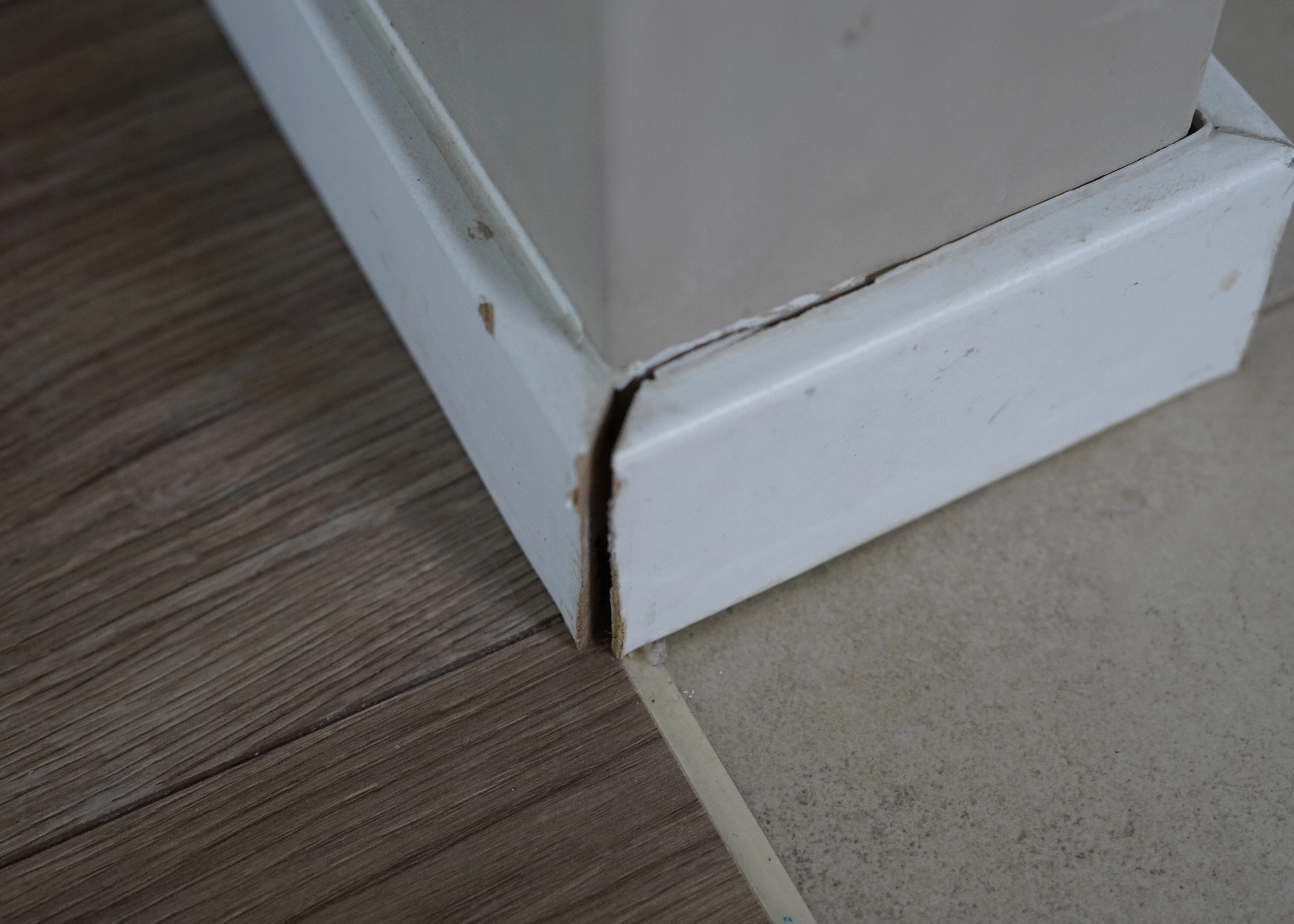 Bois ou MDF gonflés et décollés en bas des murs, signe d’humidité persistante liée aux remontées capillaires, pouvant abîmer les meubles.